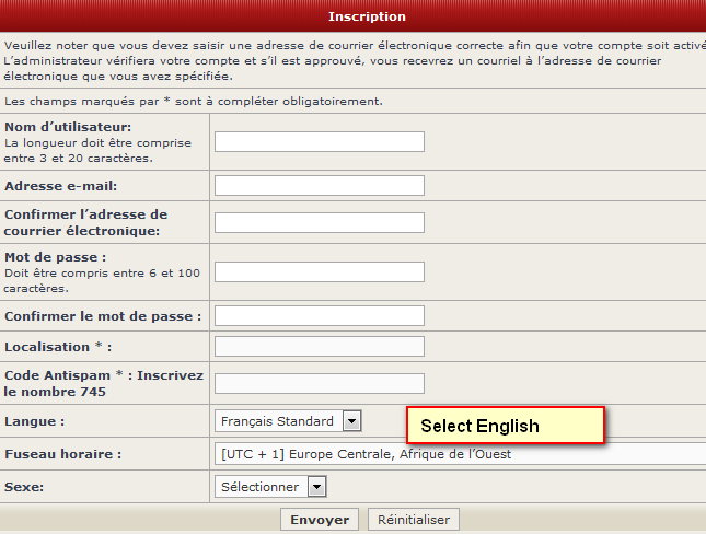 Hi, go to diapositif/forum and clic on "M'enregistrer" Then agree and on the next page select English Denis