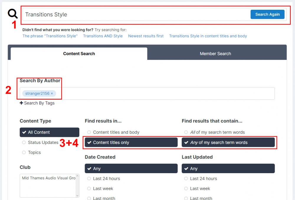 Hi Christina, ProShow Producer styles and transitions cannot be directly integrated into PTE, you can only adapt manually, i.e. create them in PTE again. I, just like you, have been a user of PSP for a long time, there are already quite a few of us here, after the closure of Photodex. You can find here my styles and transitions, including those adapted from the PSP, and freely distributed. To do this, you need to use the advanced search form on the forum, as shown in the figure below. Good luck! Paul