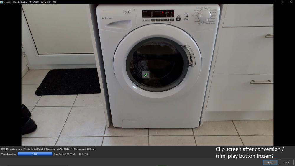 I think I may not have explained my problem correctly. I select a video clip from the folder of slides or videos that I am using in the show, right click & select convert /trim from the options box, do one or other or both to the clip. When PTE finishes doing either or both, it ends with a full screen image of the last frame of the clip, in the centre is a green arrow depicting completion. Bottom right are two buttons Play & Close, single or double click the play button & nothing happens, maybe because the end frame is depicted? Click close & the converted /trimmed clip is shown in the file list with the original name or number with Converted added. Is it me or a bug? See attached screen shot.