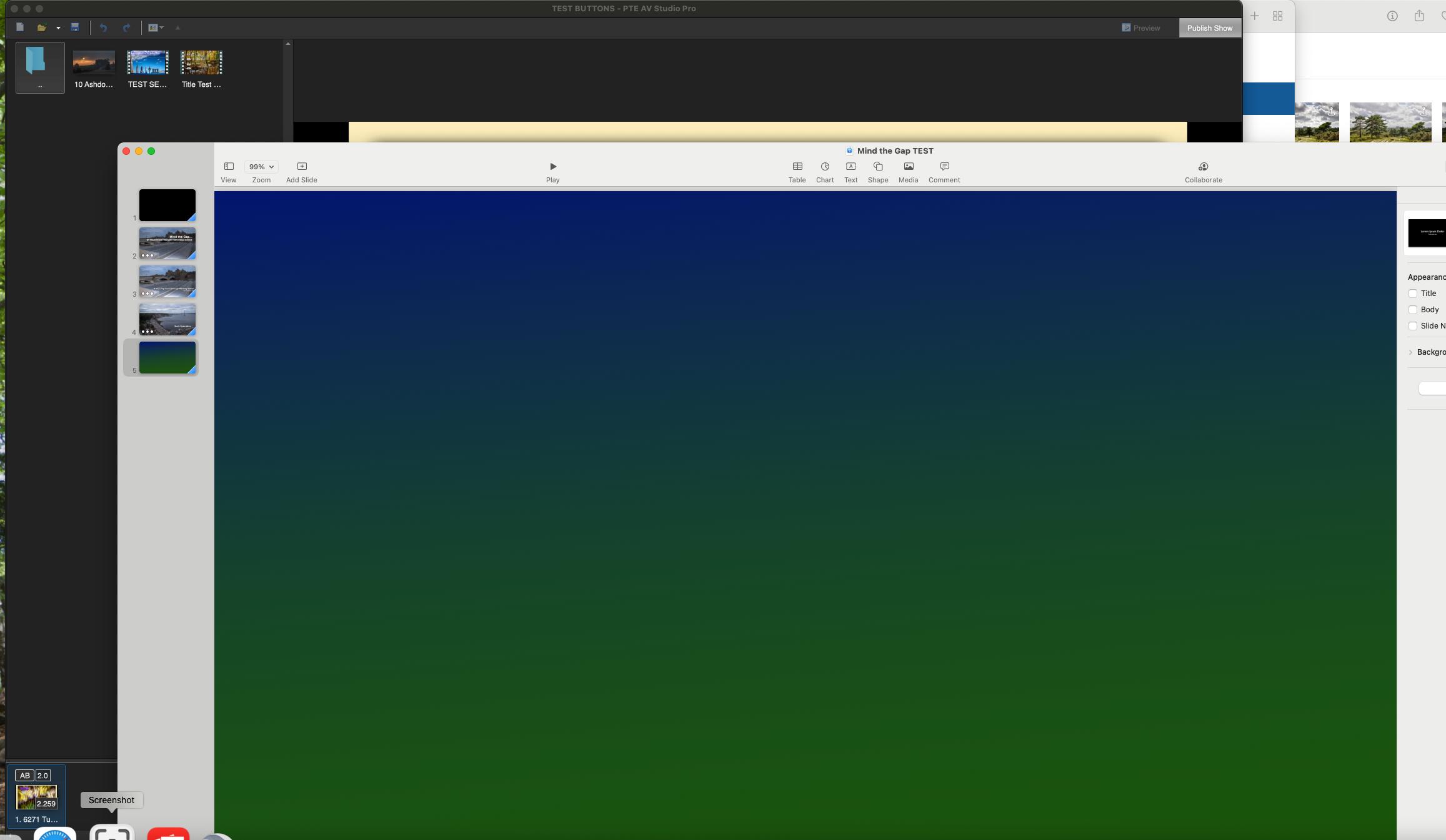 Sorry to bring up the subject again but referring back to "Using Buttons [solved], I have further issues. I have now updated to PTE AV Studio 10.5.6 on my Mac using Monterey 12.0.1. I used to use Keynote and ran all my Keynote AV shows from a menu screen (See Screenshot A attached). Keynote no longer supports links to other Keynote files and I am now using PTE AV Studio 10 and wish to replicate a similar Menu screen. My Camera Club do this and are able to link to other files, PTE and mp4's etc., and run shows. However they are using Windows on a PC and all seems fine. When I create a test Menu file and have a button(see Screenshot B attached), I can link to other PTE, mp4's. When the application finishes, the file stays on the screen and the Menu File has reverted back to its construction view, not full screen ready for the next selection. (see Screenshot C attached). I would like the screen to return to view B ready for the next selection. Sometimes the screen hangs and I have to force quit PTE and start again. In your previous reply you suggested not to select "Run Application or Open File" is this still a problem?