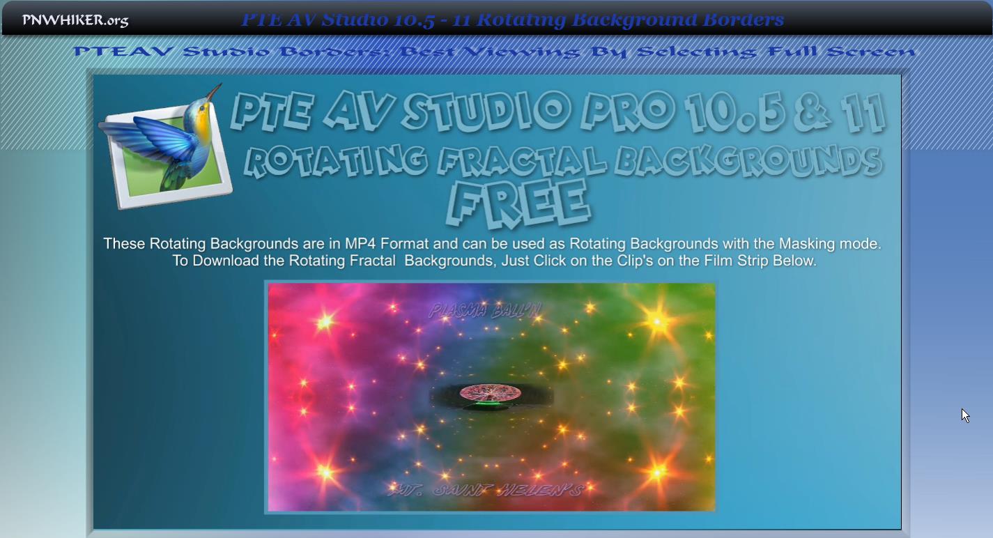 I'm posting these early, since last week i had a mild stroke, and i was going to wait till version PTE AV 11 came out, so i decided sooner would be better. FYI: Not looking for Empathy, your Gold, just hoping you can use them. Free just what it means, no BS. Merry Xmas!! Here is the web link to my web site, no log in's or any other jazz required. Rotating Gradient Backgrounds: http://www.pnwhiker.org/pteav/pteav11.htm Sample Video: http://www.pnwhiker.org/pteav/0scrn/MTABordesRotate00.mp4 Below are a couple screens shots of website.