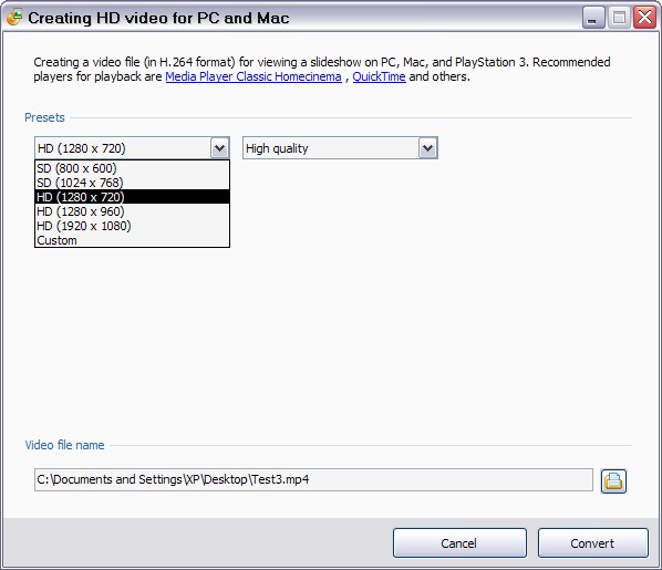 Noppes, Have you tried testing with other presets available other than HD 1920 X 1080.? I suggest testing a HD 1280 X 720 and a SD 1024 X768 preset to verify any other HD Video output. * As noted above ... try to use simple filepaths and filenames. -
