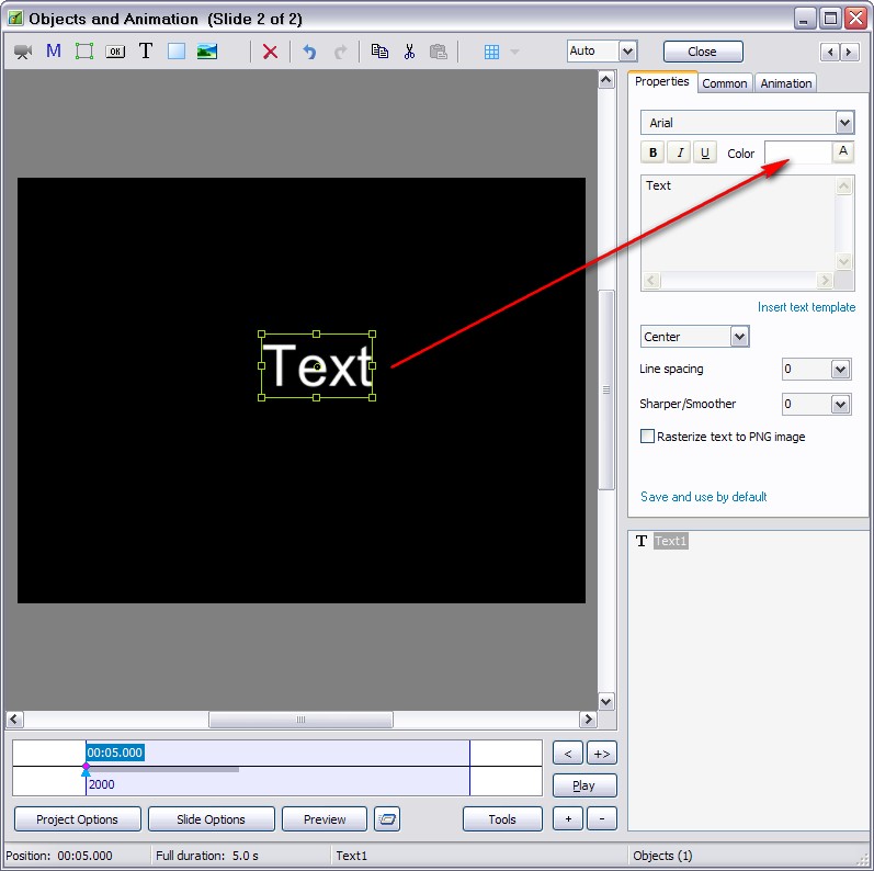 For Essentials Edition users ... its true you do not have the Defaults tab availability in Project Options. However, you can still control the color of the Text Object individually within the O&A window of the text object Properties tab. (See attached image) * or from the Online Help see : http://docs.picturestoexe.com/en/objects-and-animation/properties_tab (about halfway down the page is the section For Text Objects.)