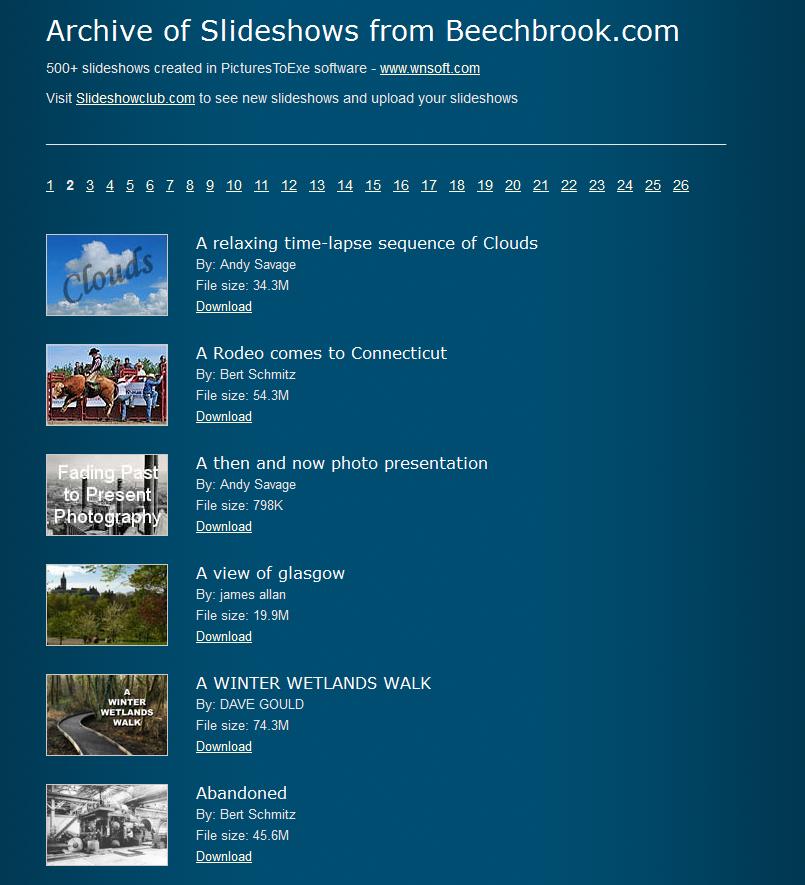 Bert, You must not have looked in the right place. Old Slideshows from the past (formerly on Beechbrook site) are listed on the Archives of Slideshows tab (at the top). Only the new slideshows (since the closing of Beechbrook site) appear in the main window section of Slideshowclub. I found your old slideshow upload quite effortlessly.