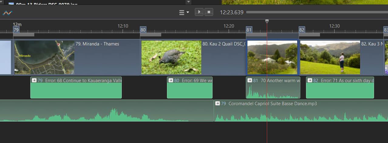 I have just completed an AV with a large number of commentary clips using PTE AV Studio Pro. The AV is optimised for HD 4K TV and its size is 294 kB As I neared the end of the production I started noticing that of some of the commentary clips had mysteriously changed from the conventional audio representation. They now displayed the word "Error" before the file reference and the display no longer showed a waveform but a block of green colour. This seems to be random and I can see no differences in the way the were originally produced. You can see this on the attached Screen shot: clip 70 attached to slide 81 is fine but the others all display the Error notice and have no audio content just a green rectangle. However it does not seem to affect the actual clip and it still sounds OK even when published as an MP4 production. Is this a bug either on my computer or in PTE, or is it trying to tell me something?