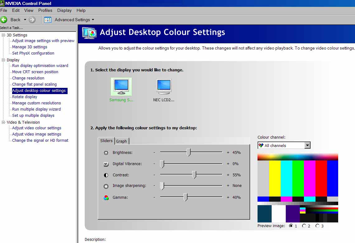 These suggestions apply to Nvidia graphics on Windows XP, other cards and Vista will probably have similar options. To achieve a satisfactory display across 2 monitors, ideally the monitors should be identical, or at least the pixel dimensions should be the same, otherwise half the image will appear distorted on one of the monitors depending on the set-up. You can however prove the set-up using dis-similar screens You do not need an additional graphics card. If you have Nvidia graphics card, the driver software includes "Nvidia control panel". You can find this by "right clicking" on the desk top then selecting the option from the pop-up box. Using the option shown below on Panel 1. The two monitors will appear as a single monitor to Pic to Exe. You then need to open "Display" from the Control panel, click on Properties, select Settings, and then select your "wide" screen resolution. Ideally the screen resolution, the settings in Pic to Exe and your Image files should have the same dimensions, it is not essential, as Pic to Exe will scale the images. Panel 2. Shows how you can match the Colour, Contrast and Brightness of the displayed image parts.