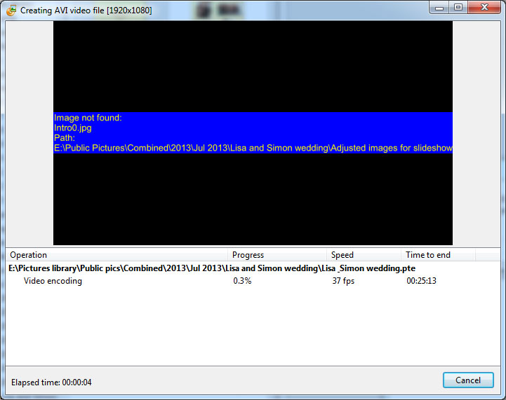 Hi, I'm running PTE deluxe 8.0.9. I've already published a slideshow as mp4 and it worked fine. Now I want to publish the same slideshow as avi, but PTE can't seem to locate the image files. I get a black screen with a blue band across it - please see attached screenshot . In fact I get the same result whichever format I try to publish it in. A friend who is very experienced in PTE (Anthony Brewer) has tried publishing one of his slideshows as avi and has the same issue. Please can anyone tell me what I'm doing wrong?