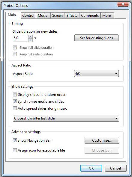 Suggestions : 1. Move options "Show full slide duration" and "Keep full slide duration" to Project Options >> Main French (déplacer les options "Afficher la durée totale des vues" et "Conserver la durée totale des vues" dans Options du projet >> Onglet Principal 2. Create tools menu that replaces advanced options French (Créer un menu Outils en remplacement de Affichage >> Options avancées)