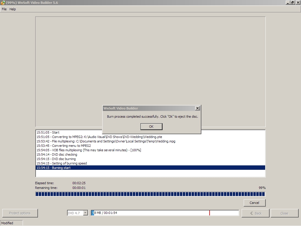 Hi The video is only about 2 minutes long and was just a test sequence. My DVD Burner only burns DVDs at 1-4X and in the past when I have burned a short test sequence there is quite a long delay after the burn whilst writing the lead in and out data. I used to use Nero Version 6 Vision Express but found this a very lengthy process compared to VideoBuilder and also more complicated to use which is why I upgraded when VB first came out. I have this problem now with both VB Version 5.6 and 6.0 and wonder whether my Version 5.6 has been changed when I extended the licence. I have never had to disable my Anti-Virus software in the past but I will carry out another test and see what happens. My screen shots show the atapi error in Event Viewer and is the same whatever version of PTE/VB I use for this test. The other two screenshots show one success and one failure (albeit in Version 5.6). One other thing, in both cases despite clicking OK for the completion and ejection of the DVD it is never ejected.