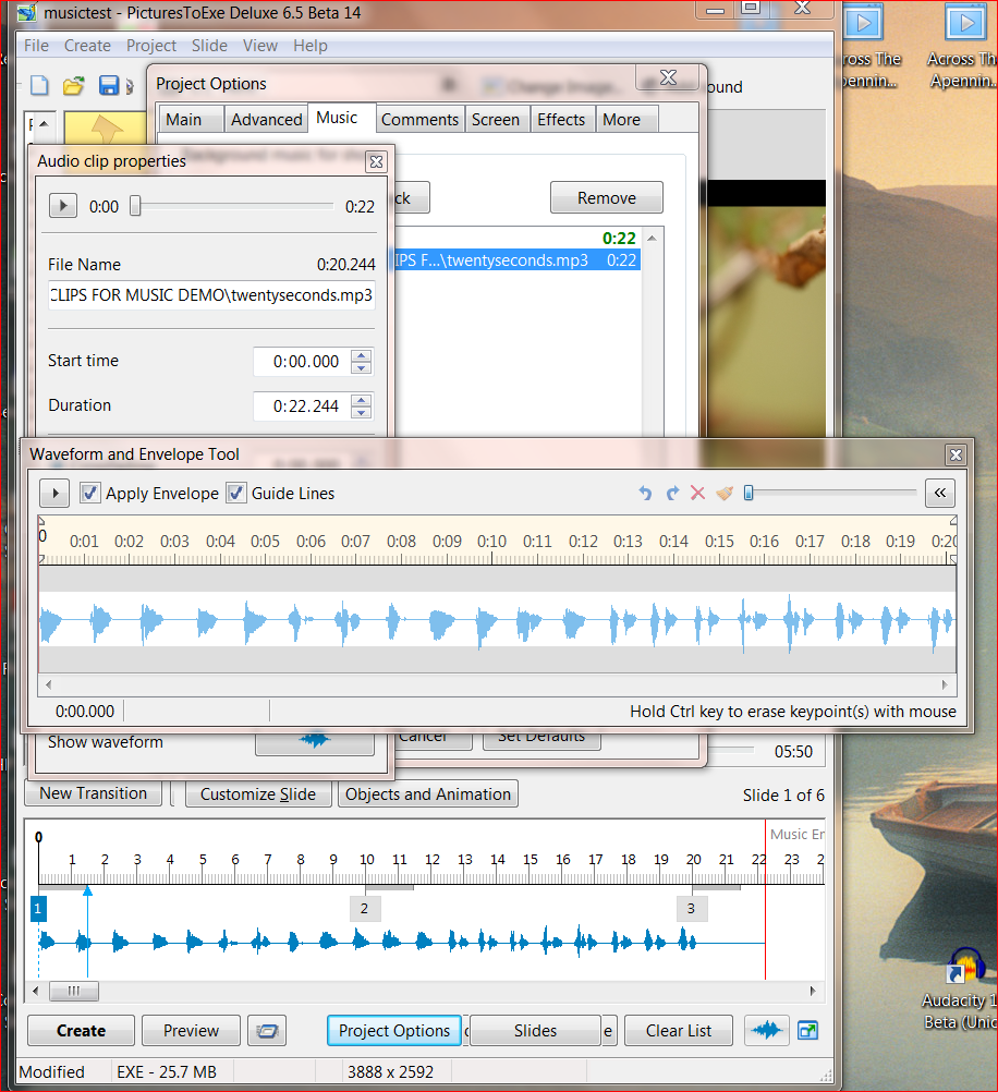 Igor Posted July 28, 2010 Author Report Posted July 28, 2010 PicturesToExe Deluxe 6.5 Beta 14 is availableIt's Release Candidate.Download link:http://www.wnsoft.com/apr/picturestoexe-beta.zip (7 MB)Changes in this beta:+ The floating window with proporties of an audio clip displays original duration now. * Various improvements in audio editing.* Fixed issue with reading of Comment field from EXIF date in some JPEG images.