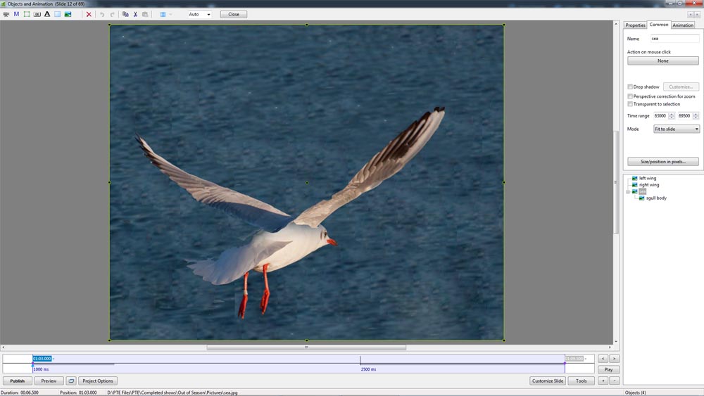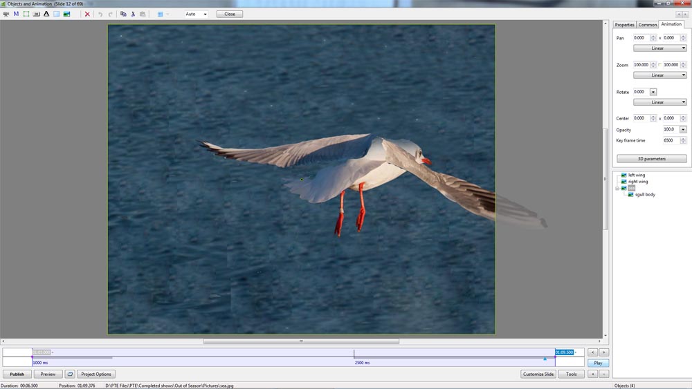 Guest Yachtsman1 Posted March 19, 2012 Report Posted March 19, 2012 Hi LinI tried to follow your instructions, but started to lose it at item 3. Step 1: open PTE and put the png of the gull's body in as a starting place.Step 2: go to Objects and Animations and add a frameStep 3: select the gull's body, right click and choose "cut" Where do I select the gulls body from the body itself, or the added items box, tried both ways & settled on the body. Select the body from the stack in the Objects ListStep 4. paste the "cut" (body of the gull) as a child of the frame you addedStep 5. add the left wing as a child of the frame and size it appropriatelyStep 6. add the right wing as a child of the frame and size it appropriately - a little larger than the left wing because it's closer to the camera viewStep 7. move the child components (body and wings) so that the gull's body is in the center and the right wing is on the top of the "stack" with the left wing on the bottomThen at step 7, how do I move the components in the stack,Click on the object to select it, then Ctrl Page UP, Ctrl Page Dn to move it up or down incidentally I think both wings should be on top with the body below.Don't "think" so much - it will get you in trouble until you know what you're doing.... Do it like I said...Step 8. click on each wing and move them into their rough starting positions.Step 9. click on the small dot in the center (the center) of the bounding rectangle, of one of the wings. Hold down the shift key and drag this dot to the center of the gull's body adjacent to the base of the wing where it attaches to the body of the gullStep10 repeat above for the other wingThis again went wrong, when I clicked & dragged the dot, the opposite wing started to move, so I gave up then.Did you hold down the shift key? If not, it won't work... Incidentally, when I said I had acheived this action in my first version, I did not use the method you describe, I just dragged the various components from left to right & twisted the wings as I went and clicked various actions until I got an acceptable (to me) action. I have added screen shots of what I did following your method.Eric, I have no idea what you may have done in the past. Apparently neither do you or you wouldn't need help. I don't know how it would be possible to get what you are asking for any other way than the way I've described for you. The problem seems to be that you simply have very limited experience with working with objects and perhaps a bit of a problem with listening carefully before creating an argument in your mind about how to proceed. As the manual says, you need to "practice." One of the elementary things is to learn how to move objects in the objects list and how to move the "center" of an object. The PTE file I sent you has a working animation of your gull flapping it's wings. It works correctly. If you would like, I will make you an AVI tutorial and show you how to do it step by step. You would probably learn a good deal if you just availed yourself of all the tutorials I and others have provided in the tutorials section. They cover all the basics and a host of other things which you probably will find useful. It takes some time and practice to get your head wrapped around the basics and you need to walk before you run.There is no reason why you can't learn to do the basic animations if you want to include them in your shows. There are "easy" ways and "hard" ways to do things. Experience will teach you the easy ways, but listening to people who have been doing it for a long time can save you lots of headaches along the way. My advice would be to forget about how you might have done this in the past and learn to do it the easy way. Open the pte file I gave you and run the preview. Look at the Objects List and see where things are. Examine the keyframes and their times and which objects go with which keyframes. Let me know if you want an AVI turorial and I'll make one for you to get you started.Best regards,LinRegards EricYachtsman1.PS forgot pic 9 Quote