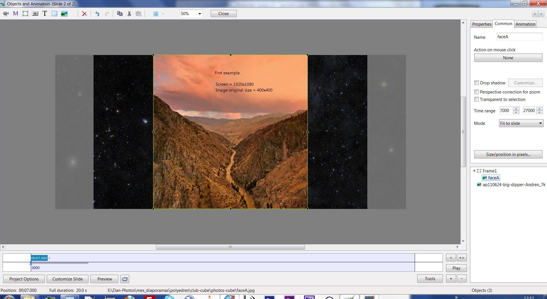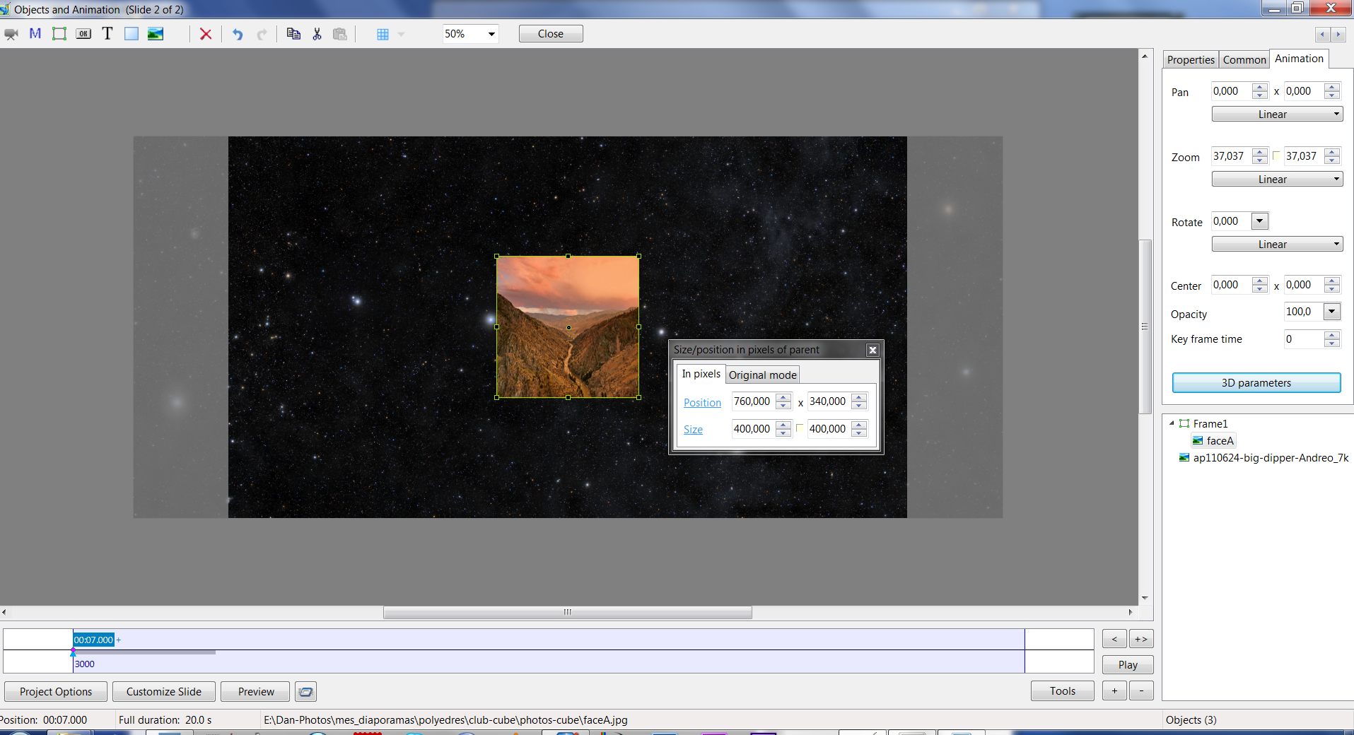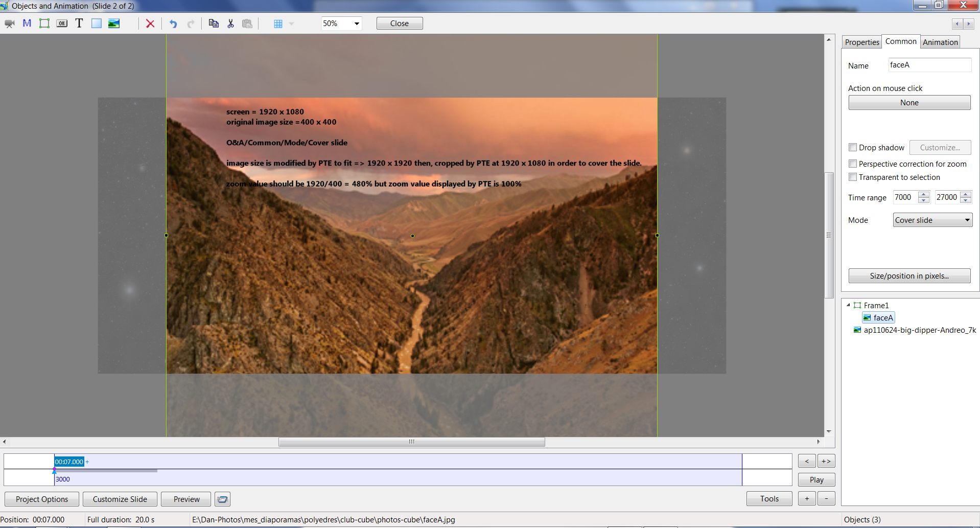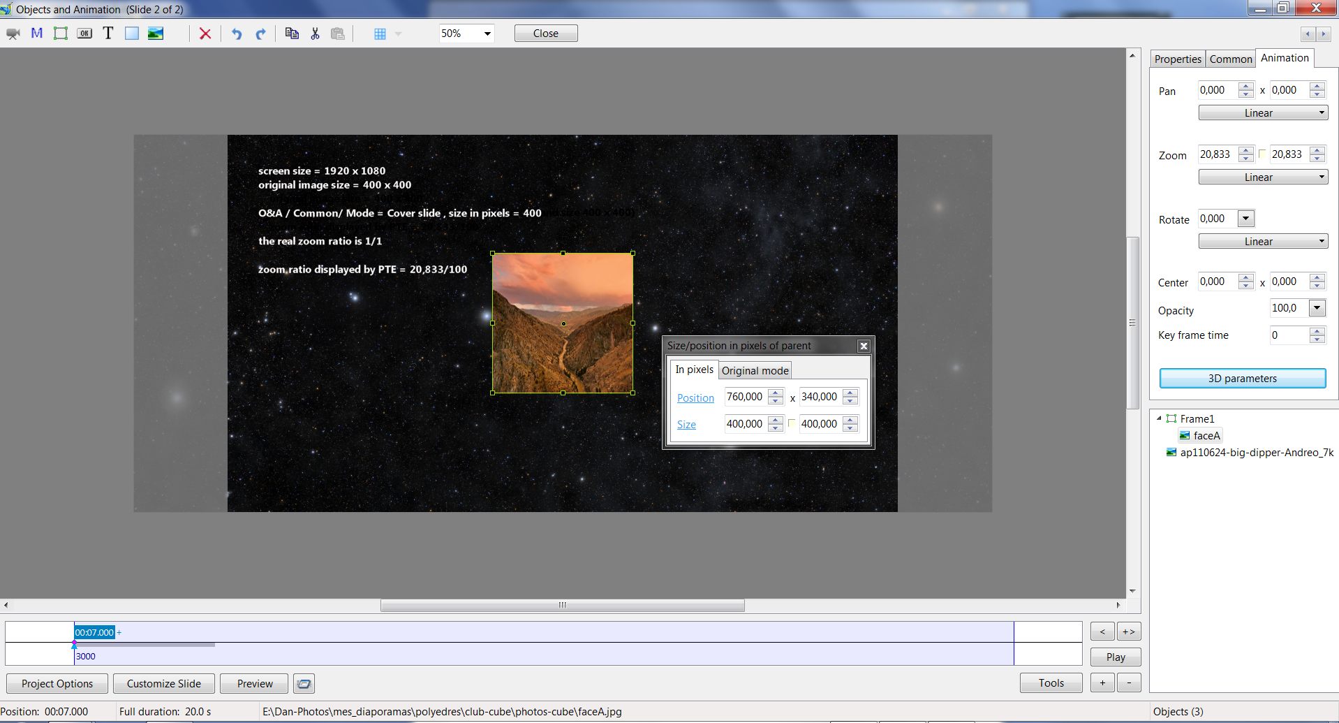Picsel Posted January 31, 2013 Report Posted January 31, 2013 Original size mode is needed by photographers who want to keep the original image size.Several years ago there was a debat about original size mode. If I remember well, JP Dollangere was a very strong supporter of this option. He was right! Most of photographers, who make AV shows, want to keep their original image size and do not want to see their work be modified by software. As it is today, even in v750, PTE does not offer this possibility.If you want to keep original image size, image by image, you have to1) select a mode (fit to slide or cover slide)2) set the right size and position in size/ position in pixels.Doing that, the zoom values displayed by PTE are false and require specific calculation.That is taking too long time and is a source of errors in case of animations!It would be very interesting to have a third mode "original size" which will allow to keep the original size of their image at zoom= 100%.This option will also ease a lot the work for those who want to make accurate 3D animations.First example.Screen = 1920x1080Image original size = 400x4000&ACommon / Mode1) Fit to size => image size becomes 1080x1080 / O&A > PTE zoom value =100% (that is false, it should be 270= 1080/400) see att 1 : 2) Cover slide => image size becomes 1920x1920 cropped at 1920x1080 / O&A > PTE zoom value = 100% (that is false, it should be 480= 1920/400) see att 4 : The fact that zoom value displayed by PTE is false may introduce errors in the choice of image resolution by the AV makerThen, if I want to recover the original size of my image I have two choices :1) select Fit to slide- then size/ position in pixels- set size 400x400but in this case PTE Zoom value is no longer 100% but 37,037 although the real image ratio is 1/1see attachment 2,3att. 2 : att. 3 :2) select Cover slide- then size/ position in pixels- set size 400x400but in this case PTE Zoom value is no longer 100% although the real image ratio is still 1/1see attachment 5,6att 5 = att 6 =If you want to make accurate animation using original image size, then you have to modify all zoom value given by PTE depending on the selected mode. That is not logical at all and too much time consuming.Second exampleIf you choose "fit to slide" mode for all images whose height > width, then whatever the image definition in pixels, PTE will give them the same number of pixels in height (slide height) and the same zoom value =100% which is totaly wrong and not logical at all. That is very confusing for those who wants to work keeping original image size.Daniel Quote