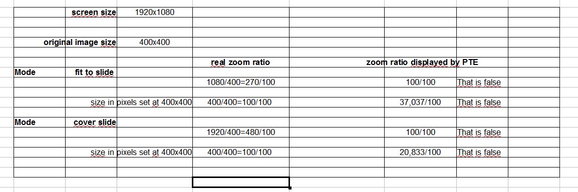 Picsel Posted February 4, 2013 Author Report Posted February 4, 2013 ....You do not seem to like this model,...Xaver,among other people who ask me to report this question there is a mathematician, member of our club and photographer, very funny indeed!As I said in my previous post, the model you are speakink about is perfect for me within the both options- fit to slide- cover slidebut you should consider that zoom 100% does not mean the same thing in both cases and so has different "definitions"....let assume that - slide dimensions are W (width in pixels) and H (height in pixels)- image dimensions are w (width in pixels) and h (height in pixels)- z= real zoom value applied by PTE to the imagethen : in case of "fit to slide" if (w/W)<(h/H) then z= w/W displayed as "100%"if (h/H)<(w/W) then z= h/H displayed as "100%"in case of "cover slide" if (w/W)<(h/H) then z= h/H displayed as "100%"if (h/H)<(w/W) then z= w/W displayed as "100%"So you must admit as a mathematecian there is not only one definition but 4 different definitions for zoom=100%As I also said previously : a lot of people, mainly photographers do not want their photographies to be recalculated by PTE and want to keep the original size of their image.To day, as it is, they have to select size/positions in pixels then specify or click on size, and they have to do that image by image. The zoom value displayed in that case is wrong, it should be 100% for original size (that is just another definition of zoom = 100% for z=1 in such a particular case !)So to be clear enough, I just would like a third option which could ease the way to do that. All the "ingredients" already exist inside PTE. .... Keep in mind that an original mode typically refers to a screen resolution,...I disagree, the original mode refer to image dimensions, the screen resolution has nothing to see with that but obviously we must assume that image dimensions are compatible with the slide format which has been specified.RegardsDaniel Quote