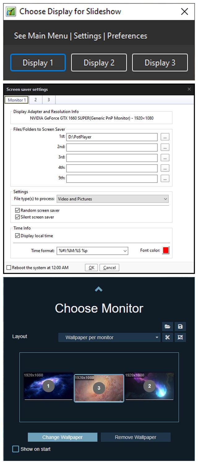 tom95521 Posted December 18, 2019 Author Report Posted December 18, 2019 I had a spare DVI monitor so I connected it to the 1660 using a displayport adapter. Windows 10 extended the desktop and PTE also recognized the 3rd monitor. Also PotPlayer can run different screensaver on each monitor. Wallpaper Engine also is running different PTE video slideshows in the background on each monitor. I do have another DVI monitor but I ran out of displayport adapters so I can't test a 4th monitor. I'm running out of desk space. Tom Quote