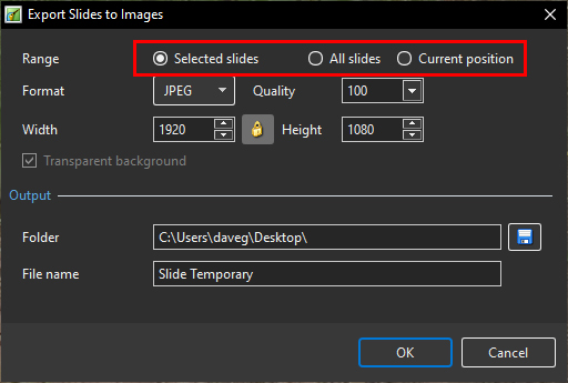 davegee Posted March 5, 2023 Report Posted March 5, 2023 Update to this Topic from Dec 2020: In Version 11 you can Export a frame from a Video as a JPEG or PNG file via the Right Click / "Export Slides to Images" command in either the Slide List or the Timeline. DG 2 Quote