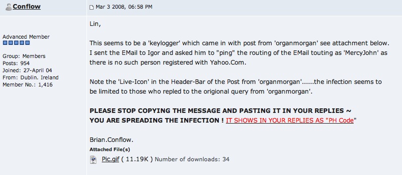 Actually, I don't think the problem with the keylogger had anything specifically to do with your name or your post but simply was associated with one of the spam posts which when "copied" and pasted (I did it as well as others) ended up spreading the keylogger. The forum software had a security weakness which I believe has since been corrected.